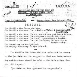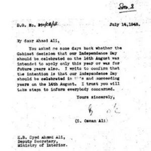 અનુવાદ: “માનનીય વડા પ્રધાને કાયદા-એ-આઝમ સુધી આ સૂચન મોકલવાની જવાબદારી લીધી છે કે જે સૂચવે છે કે સ્વતંત્રતાદિવસની ઉજવણી 15 ઑગસ્ટને બદલે 14 ઑગસ્ટે કરવી જોઈએ.”